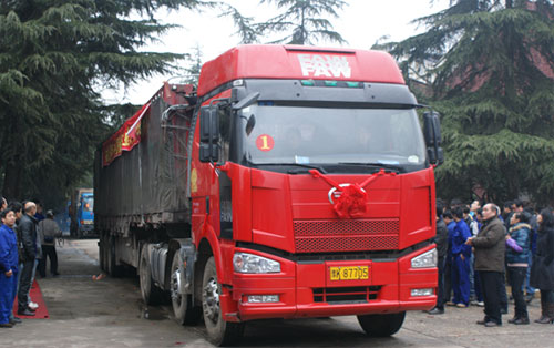 在欢快的音乐声和响亮的鞭炮声中,十几车辆井然有序开出厂门使往目的地。
